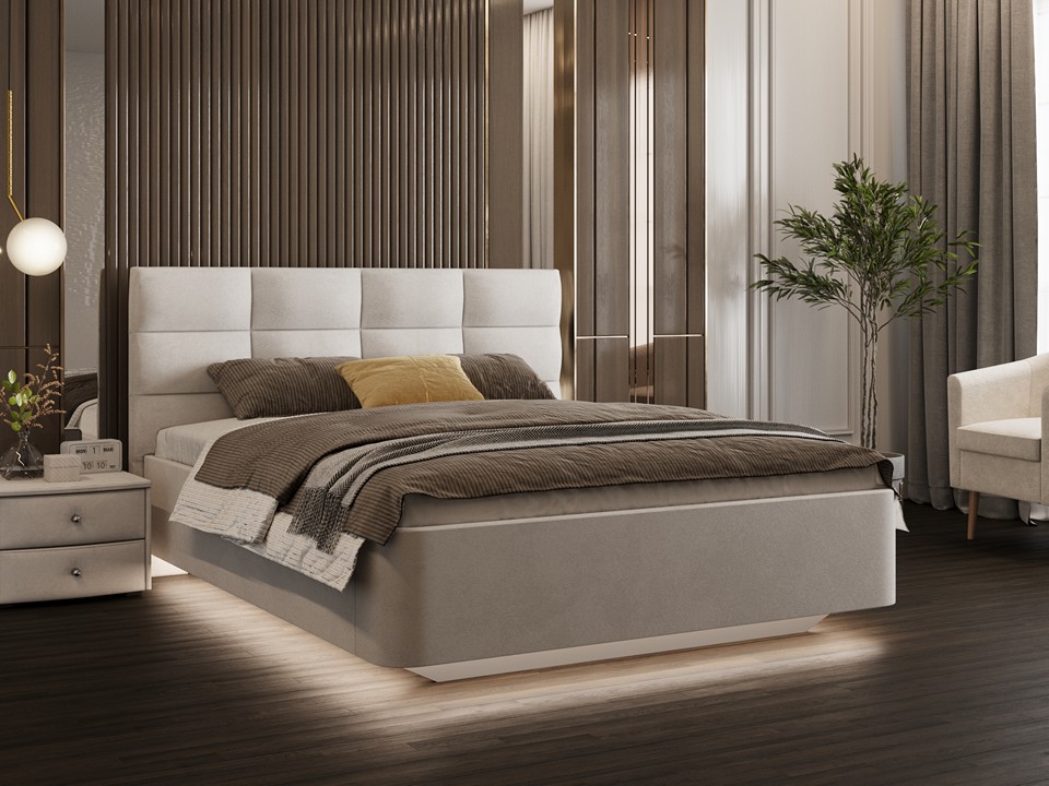 Интегрированное основание с выбором глубины залегания: 5 или 10 см. Матрас при нижнем залегании — 16–20 см, при высоком — 11–16 см. Подъёмного механизма и ящиков нет — это чистая конструкция без компромиссов в пользу хранения. Обратите внимание: рама добавляет +48 см к ширине — модель рассчитана на просторную спальню.