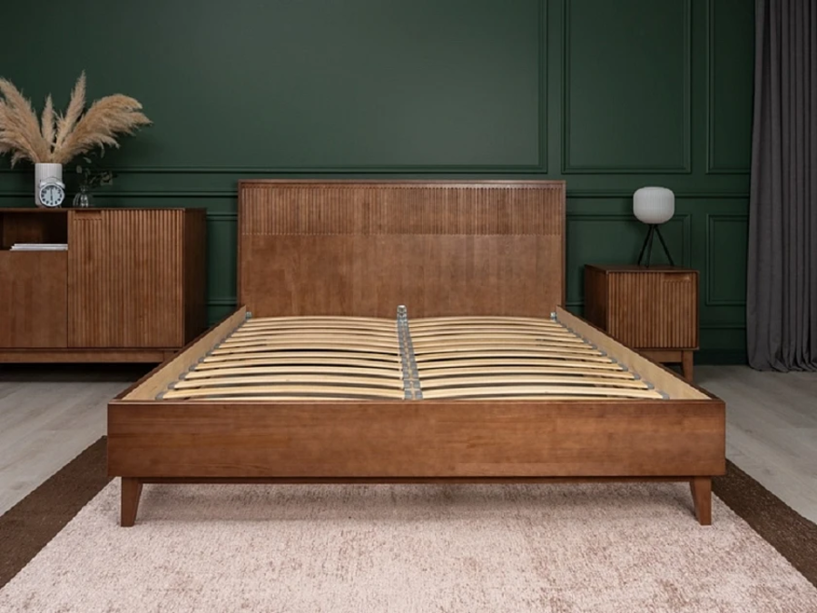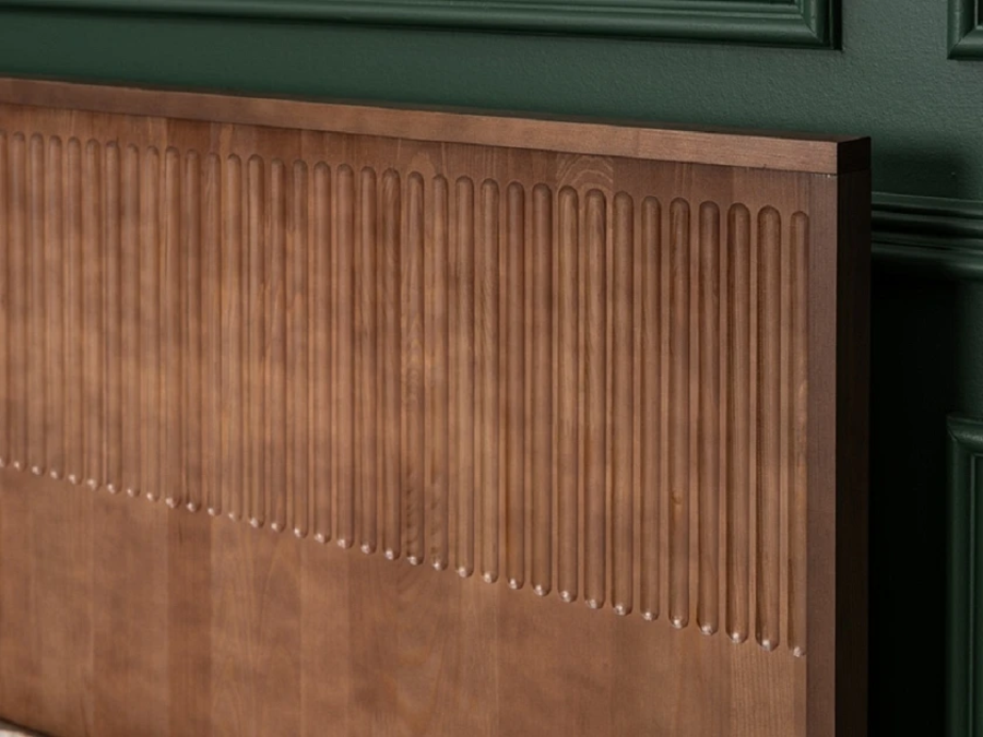 Кровать Tempo с вертикальной фрезировкой изготавливается из массива сосны, березы или дуба.